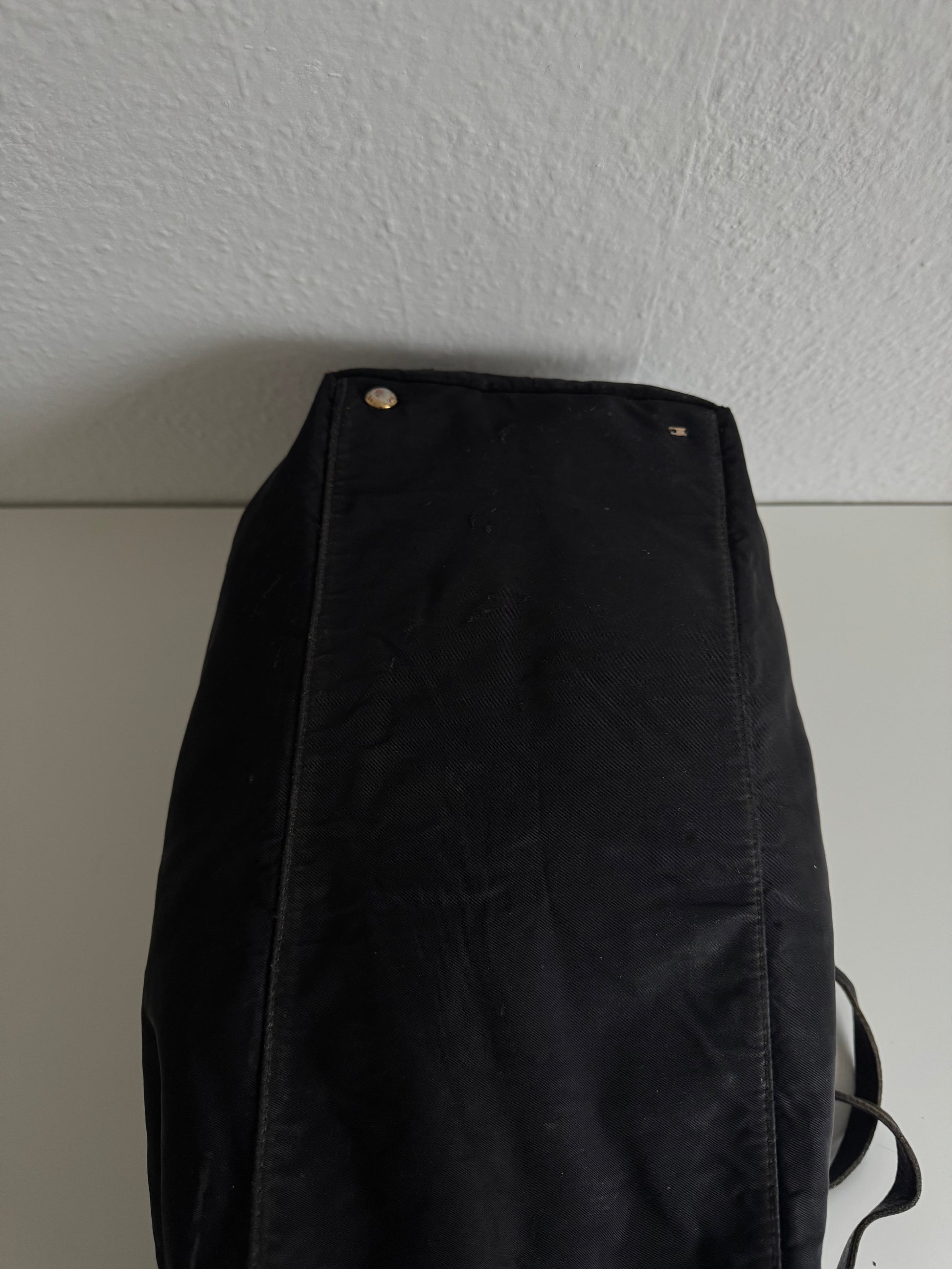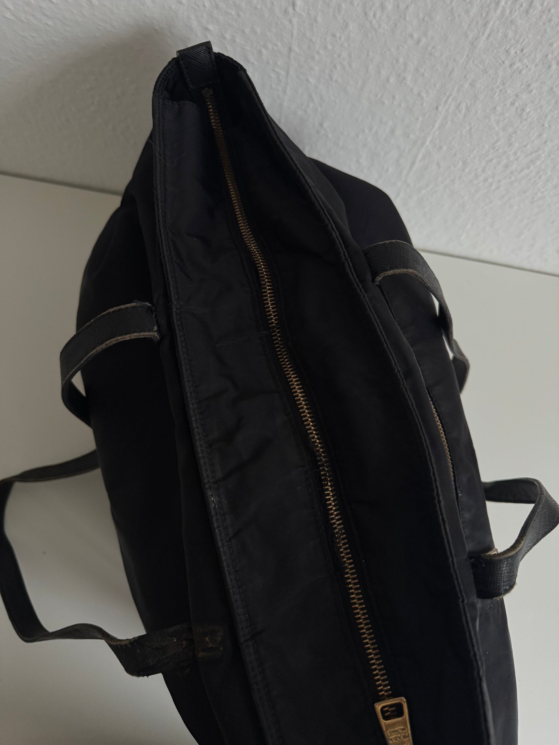 Hergestellt aus einem strapazierfähigen, wasserabweisenden und hochwertigen Material, das Prada oft für seine Taschen verwendet. Es ist leicht, flexibel und bietet ein modernes, urbanes Gefühl.